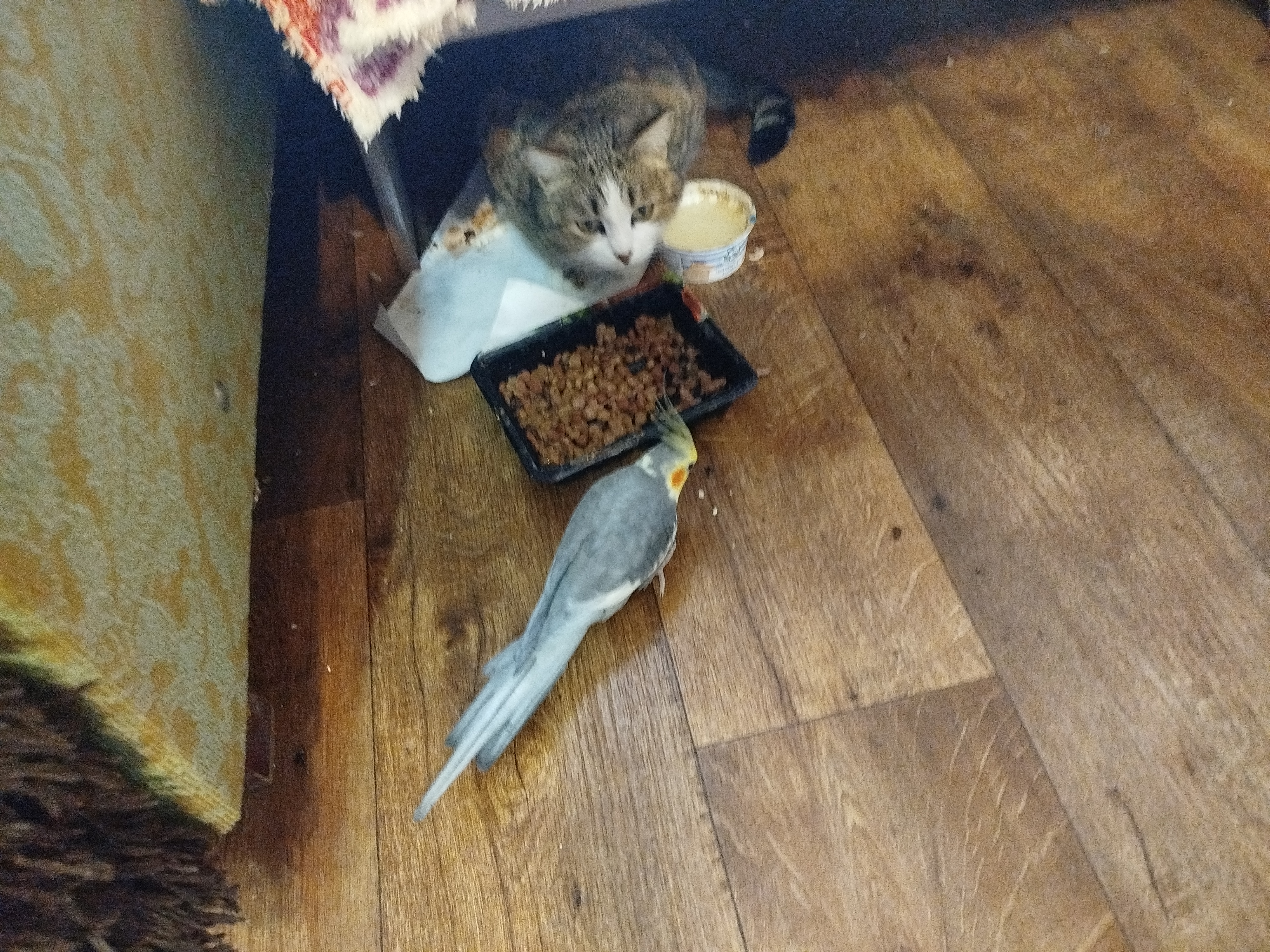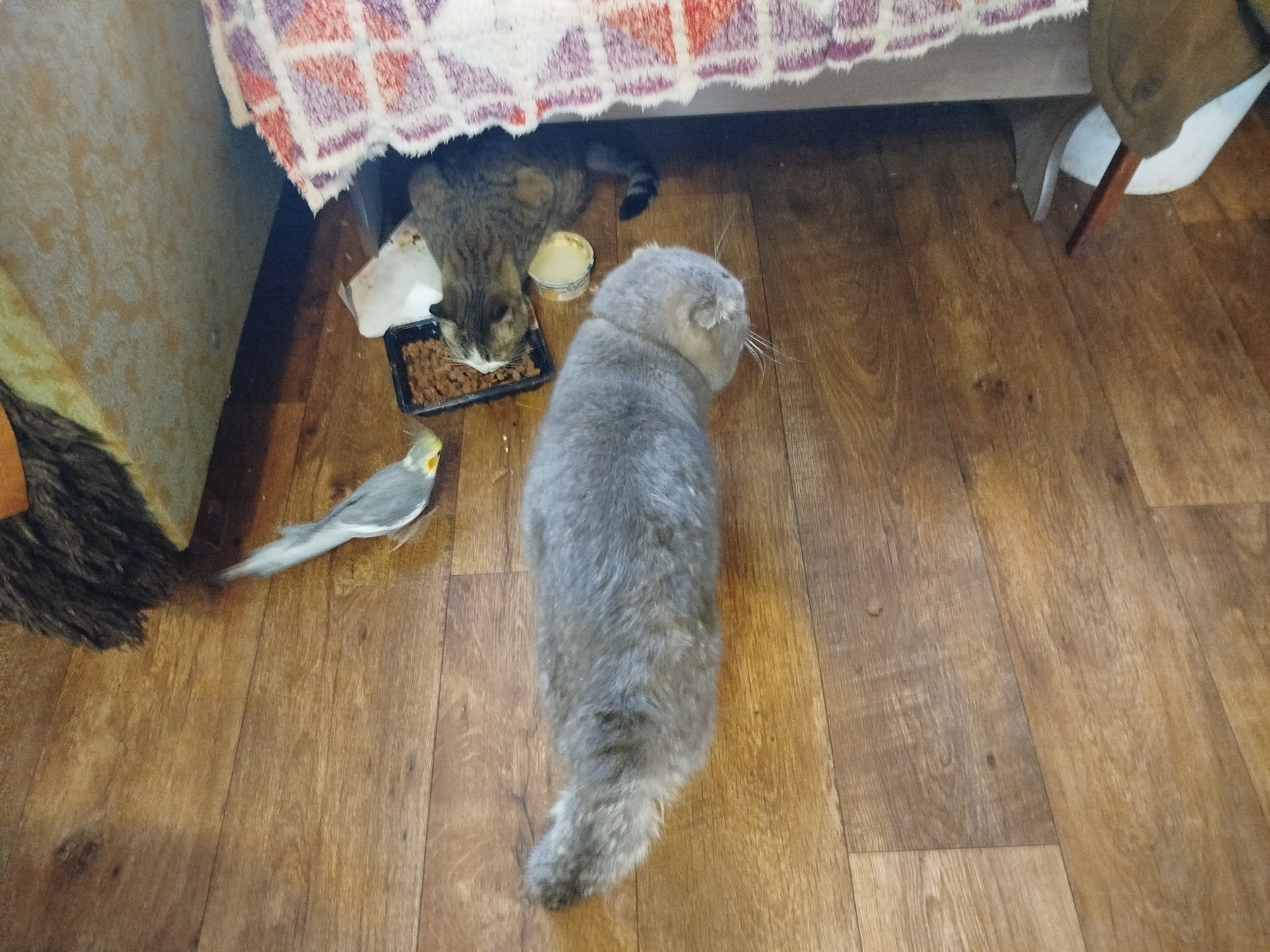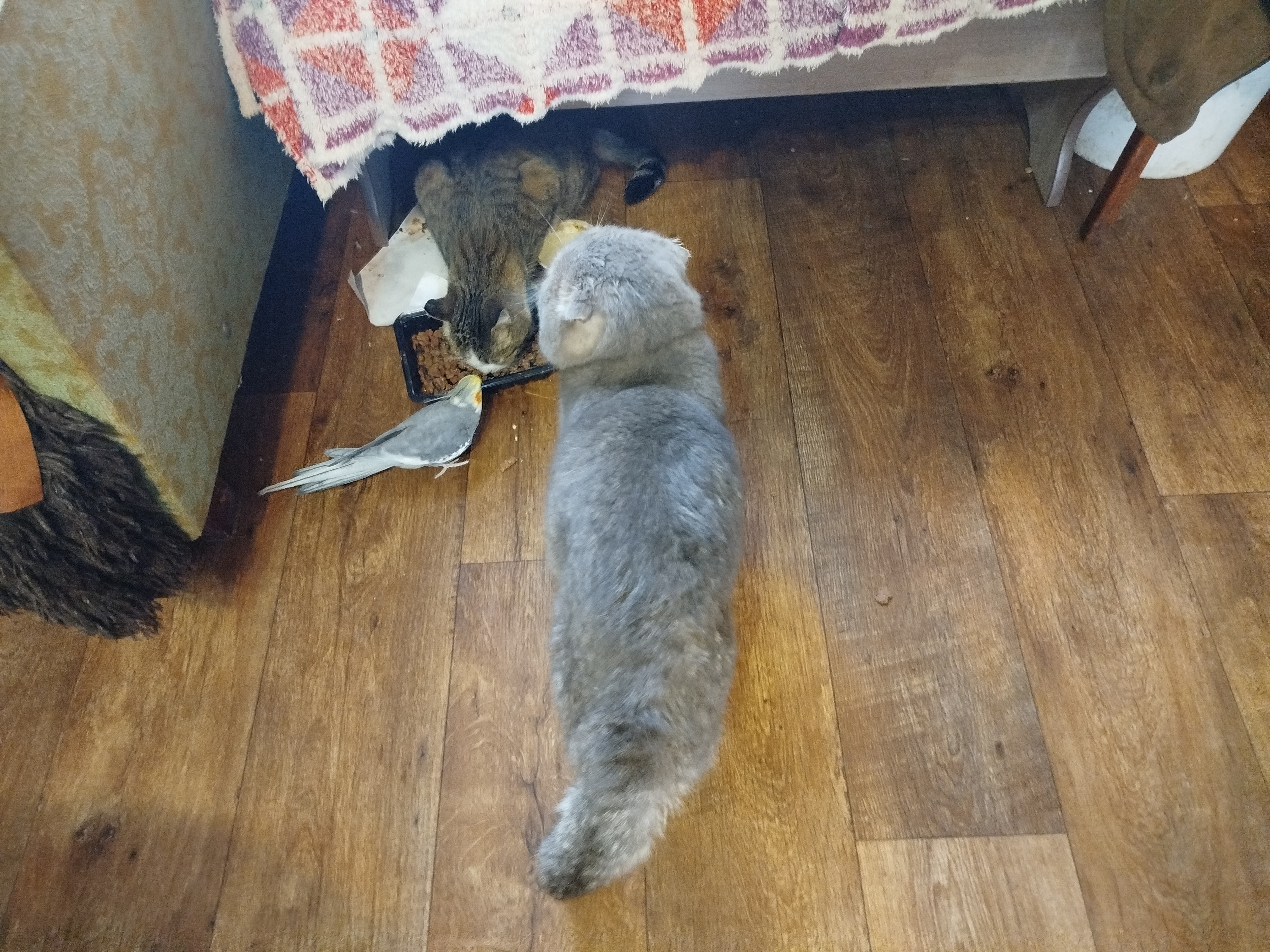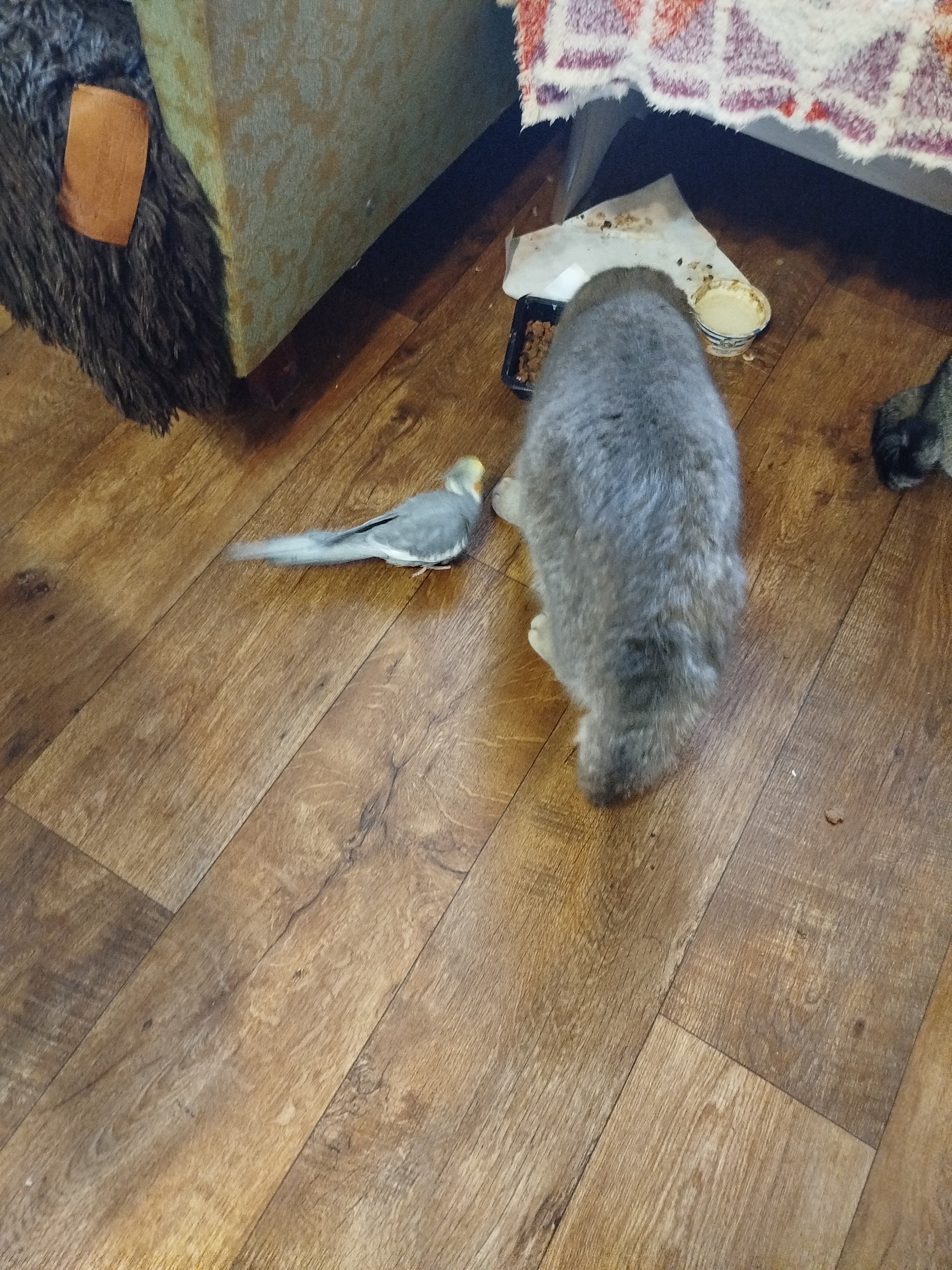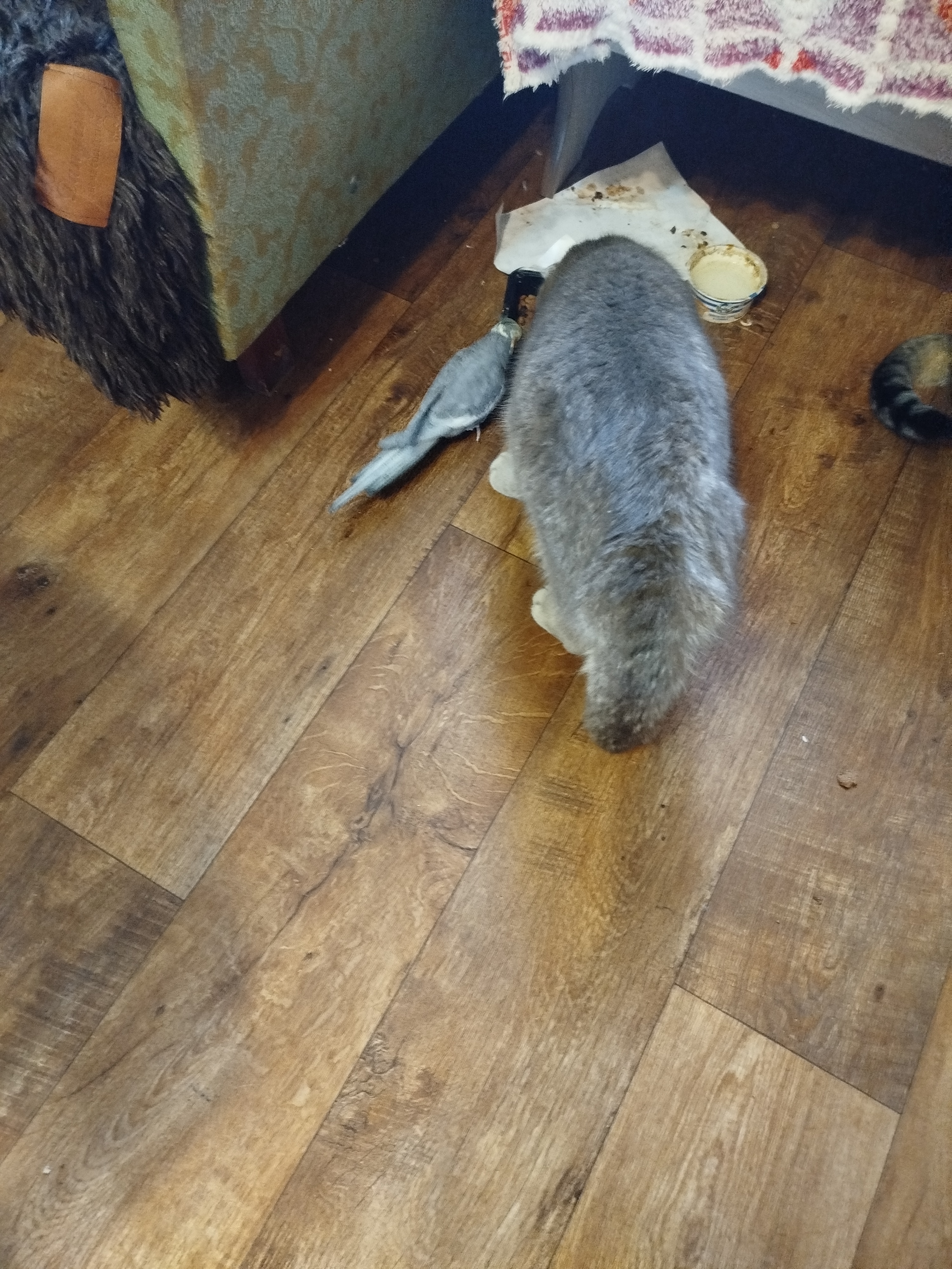 он где-то хвост погнул! Травма у него, носит пока его набекрень, и ранка там, трогать не дает, орет матом...